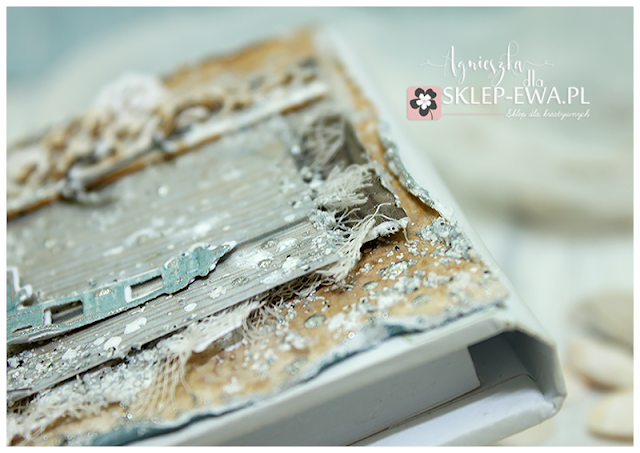 Witajcie, dzisiaj chcę wam pokazać lekko mediowy notesik. Do jego ozdoby użyłam ślicznych morskich papierów z firmy Piątek Trzynastego oraz kilku bardzo ciekawych mediów od firmy Cadence. Jednym z nich jest farba akrylowa Cadence o efekcie granitu. To bardzo ciekawy produkt o gęstej grutkowatej strukturze. Kolor który użyłam zawiera jakby drobinki wielkości grubego piasku w kilku barwach, białe, szare, grafitowe, nakładając go można uzyskać różny stopień krycia. Ja nakładałam go delikatnie. Produkt ten dość szybko schnie i bardzo ciekawie wygląda.